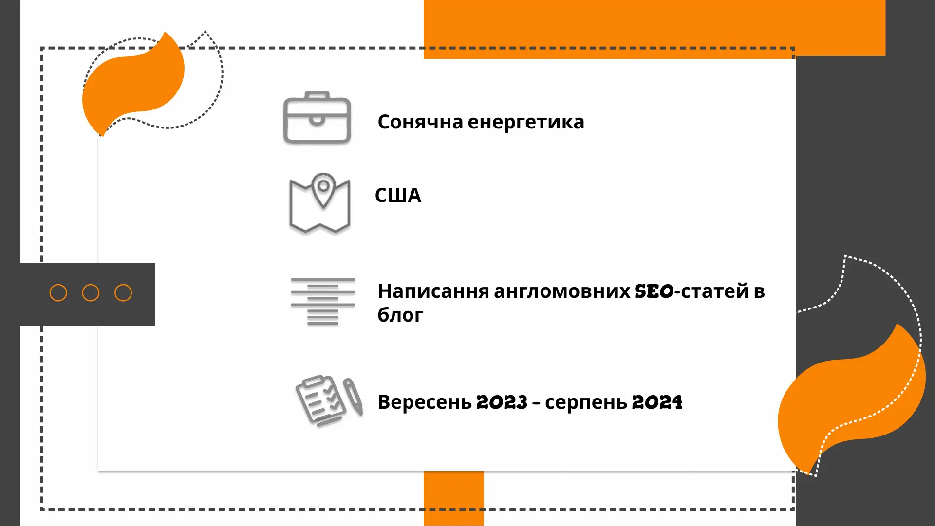 Співпраця розпочалася з розробки англомовного матеріалу на нетривіальну тему – взаємозв’язок сонячних панелей та естетики фасаду. Вже в перші дні копірайтер підготував SEO-текст, заснований на глибокому конкурентному аналізі.